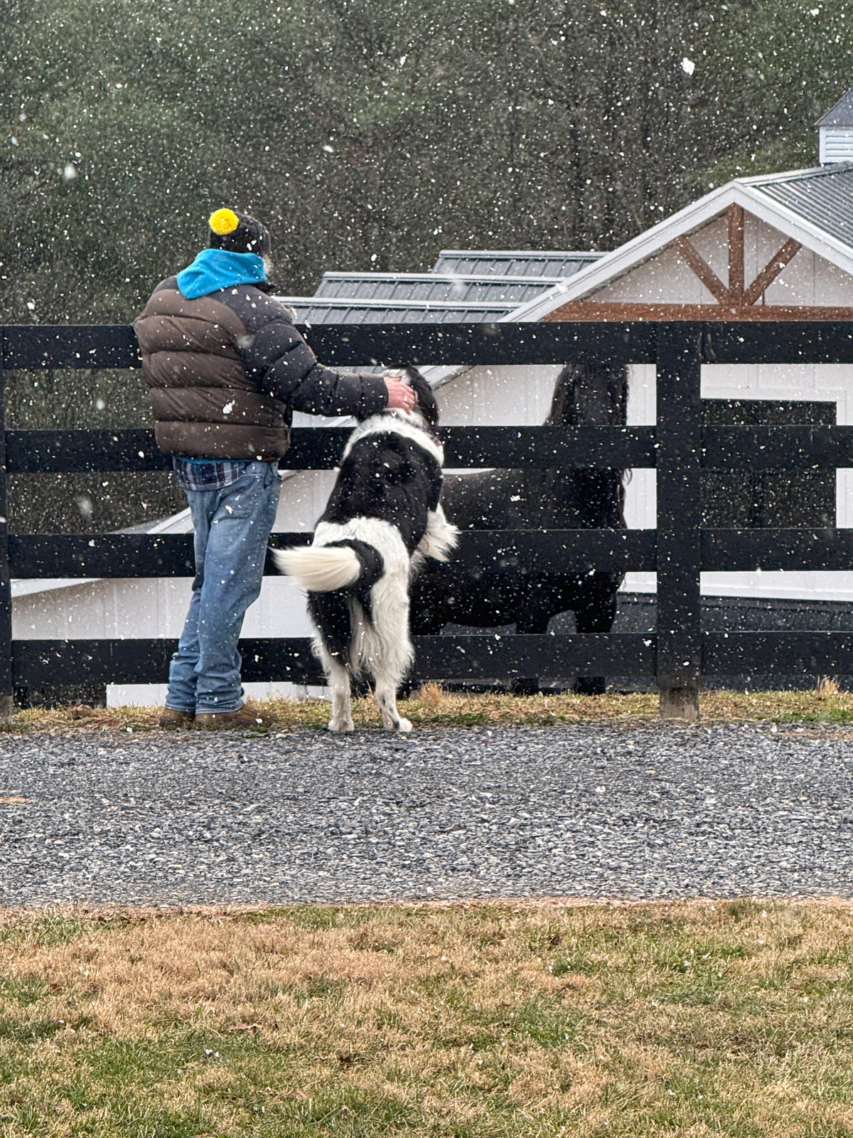 Chuck and Boomer, the loyal duo, admiring Harold—the king of Smoky Mountain Friesians. A man, his dog, and a true Friesian beauty—just another day on the farm!